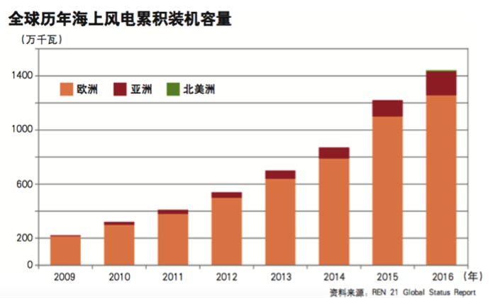 自1991年全球第一座海上風(fēng)電場在丹麥開始運(yùn)行以來,海上風(fēng)電發(fā)展已經(jīng)走過了二十余年。早期海上風(fēng)電發(fā)展速度緩慢,2008年以后,隨著風(fēng)電技術(shù)的進(jìn)步以及投資者對(duì)海上風(fēng)能資源認(rèn)識(shí)的不斷加深,已經(jīng)有多個(gè)國家將海上風(fēng)電作為未來風(fēng)電發(fā)展的主要方向海上風(fēng)電保持了持續(xù)增長的良好勢頭。