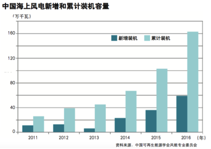 自2010年首個(gè)海上風(fēng)電并網(wǎng)項(xiàng)目上海東海大橋海上風(fēng)電場建成投產(chǎn)以來,在此后的3年里,江蘇如東3萬千瓦和15萬千瓦潮間帶試驗(yàn)、示范風(fēng)電場及其擴(kuò)建工程陸續(xù)建成。2012年底,我國海上風(fēng)電累計(jì)裝機(jī)接近40萬千瓦;受各種因素影響,2013年海上風(fēng)電發(fā)展顯著減緩;自2014年以來,我國海上風(fēng)電裝機(jī)迅速增加,當(dāng)年新增并網(wǎng)容量約20萬千瓦,全部位于江蘇省;2015年新增裝機(jī)容量為36萬千瓦,主要分布在江蘇省和福建??;2016年新增裝機(jī)154臺(tái),容量達(dá)到59萬千瓦。截至2016年底,我國已建成海上風(fēng)電累計(jì)裝機(jī)容量162萬千瓦,在全球僅次于英國與德國。我國海上風(fēng)電占全國風(fēng)電總裝機(jī)容量的比重由2011年的0.42%上升至2016年的0.96%。